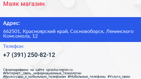 Маяк, магазин по адресу 662501, Красноярский край, Сосновоборск, Ленинского Комсомола, 12 в дальнейшем Организация, размещена в следующих категориях: