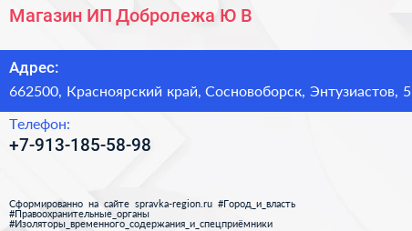 Магазин, ИП Добролежа Ю.В. по адресу 662500, Красноярский край, Сосновоборск, Энтузиастов, 5 в дальнейшем Организация, размещена в следующих категориях: