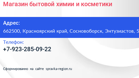 Магазин бытовой химии и косметики по адресу 662500, Красноярский край, Сосновоборск, Энтузиастов, 5 в дальнейшем Организация, размещена в следующих категориях: