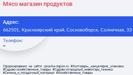 Мясо, магазин продуктов по адресу 662501, Красноярский край, Сосновоборск, Солнечная, 33 в дальнейшем Организация, размещена в следующих категориях: