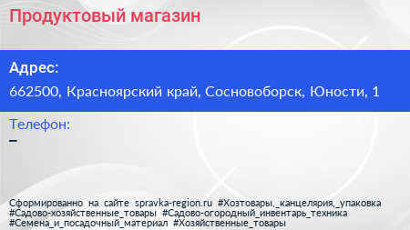 Продуктовый магазин по адресу 662500, Красноярский край, Сосновоборск, Юности, 1 в дальнейшем Организация, размещена в следующих категориях: