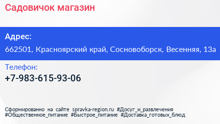 Садовичок, магазин по адресу 662501, Красноярский край, Сосновоборск, Весенняя, 13а в дальнейшем Организация, размещена в следующих категориях: