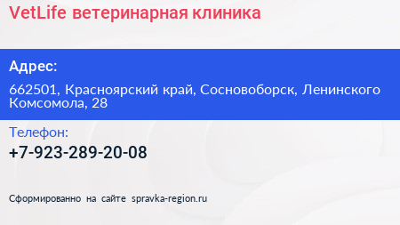 VetLife, ветеринарная клиника по адресу 662501, Красноярский край, Сосновоборск, Ленинского Комсомола, 28 в дальнейшем Организация, размещена в следующих категориях:
