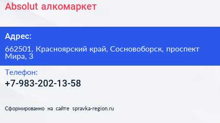 Absolut, алкомаркет по адресу 662501, Красноярский край, Сосновоборск, проспект Мира, 3 в дальнейшем Организация, размещена в следующих категориях: