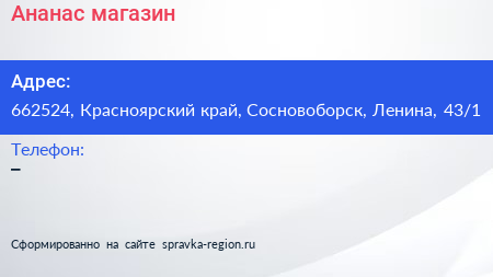 Ананас, магазин по адресу 662524, Красноярский край, Сосновоборск, Ленина, 43/1 в дальнейшем Организация, размещена в следующих категориях: