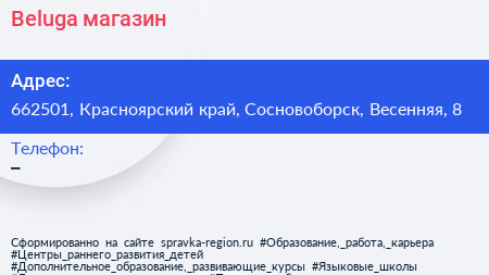 Beluga, магазин по адресу 662501, Красноярский край, Сосновоборск, Весенняя, 8 в дальнейшем Организация, размещена в следующих категориях: