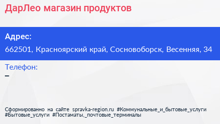 ДарЛео, магазин продуктов по адресу 662501, Красноярский край, Сосновоборск, Весенняя, 34 в дальнейшем Организация, размещена в следующих категориях: