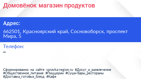 Домовёнок, магазин продуктов по адресу 662501, Красноярский край, Сосновоборск, проспект Мира, 5 в дальнейшем Организация, размещена в следующих категориях: