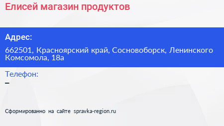 Елисей, магазин продуктов по адресу 662501, Красноярский край, Сосновоборск, Ленинского Комсомола, 18а в дальнейшем Организация, размещена в следующих категориях: