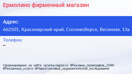 Ермолино, фирменный магазин по адресу 662501, Красноярский край, Сосновоборск, Весенняя, 13а в дальнейшем Организация, размещена в следующих категориях:
