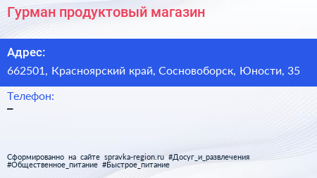 Гурман, продуктовый магазин по адресу 662501, Красноярский край, Сосновоборск, Юности, 35 в дальнейшем Организация, размещена в следующих категориях:
