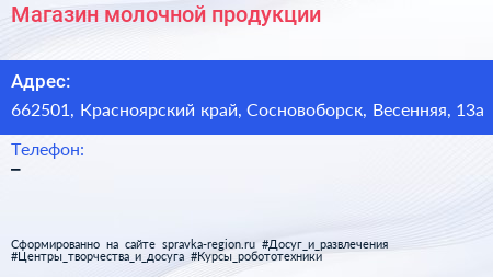 Магазин молочной продукции по адресу 662501, Красноярский край, Сосновоборск, Весенняя, 13а в дальнейшем Организация, размещена в следующих категориях: