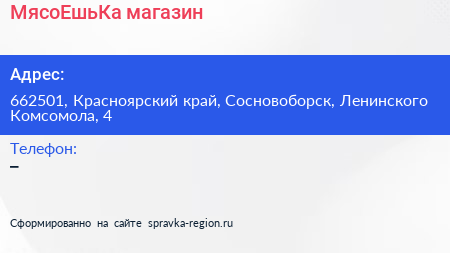 МясоЕшьКа, магазин по адресу 662501, Красноярский край, Сосновоборск, Ленинского Комсомола, 4 в дальнейшем Организация, размещена в следующих категориях: