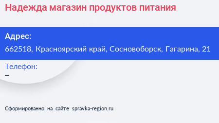 Надежда, магазин продуктов питания по адресу 662518, Красноярский край, Сосновоборск, Гагарина, 21 в дальнейшем Организация, размещена в следующих категориях: