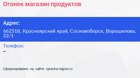 Огонек, магазин продуктов по адресу 662518, Красноярский край, Сосновоборск, Ворошилова, 22/1 в дальнейшем Организация, размещена в следующих категориях: