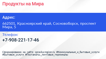 Продукты на Мира по адресу 662501, Красноярский край, Сосновоборск, проспект Мира, 5 в дальнейшем Организация, размещена в следующих категориях: