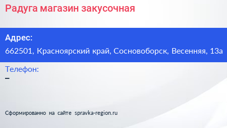 Радуга, магазин-закусочная по адресу 662501, Красноярский край, Сосновоборск, Весенняя, 13а в дальнейшем Организация, размещена в следующих категориях: