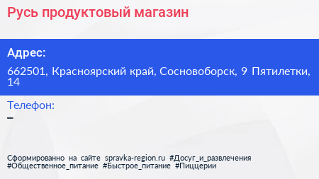 Русь, продуктовый магазин по адресу 662501, Красноярский край, Сосновоборск, 9 Пятилетки, 14 в дальнейшем Организация, размещена в следующих категориях: