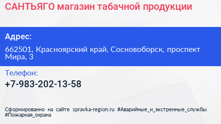 САНТЬЯГО, магазин табачной продукции по адресу 662501, Красноярский край, Сосновоборск, проспект Мира, 3 в дальнейшем Организация, размещена в следующих категориях: