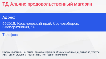 ТД Альянс, продовольственный магазин по адресу 662518, Красноярский край, Сосновоборск, Кооперативная, 10 в дальнейшем Организация, размещена в следующих категориях: