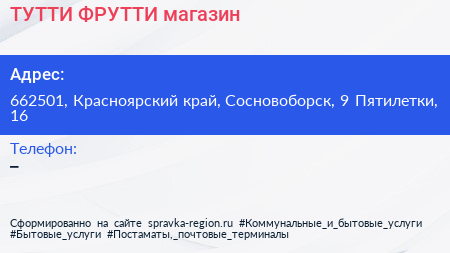 ТУТТИ ФРУТТИ, магазин по адресу 662501, Красноярский край, Сосновоборск, 9 Пятилетки, 16 в дальнейшем Организация, размещена в следующих категориях:
