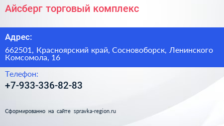 Айсберг, торговый комплекс по адресу 662501, Красноярский край, Сосновоборск, Ленинского Комсомола, 16 в дальнейшем Организация, размещена в следующих категориях: