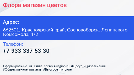 Флора, магазин цветов по адресу 662501, Красноярский край, Сосновоборск, Ленинского Комсомола, 4/2 в дальнейшем Организация, размещена в следующих категориях: