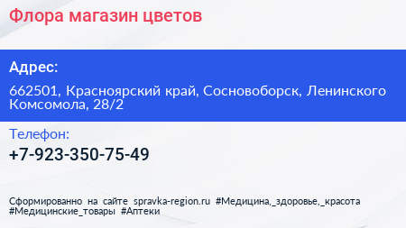 Флора, магазин цветов по адресу 662501, Красноярский край, Сосновоборск, Ленинского Комсомола, 28/2 в дальнейшем Организация, размещена в следующих категориях: