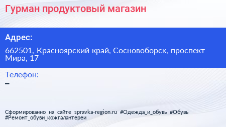 Гурман, продуктовый магазин по адресу 662501, Красноярский край, Сосновоборск, проспект Мира, 17 в дальнейшем Организация, размещена в следующих категориях:
