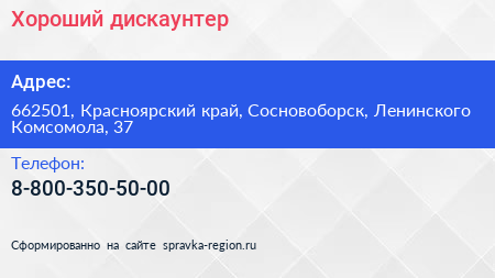 Хороший, дискаунтер по адресу 662501, Красноярский край, Сосновоборск, Ленинского Комсомола, 37 в дальнейшем Организация, размещена в следующих категориях: