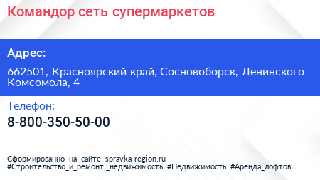 Командор, сеть супермаркетов по адресу 662501, Красноярский край, Сосновоборск, Ленинского Комсомола, 4 в дальнейшем Организация, размещена в следующих категориях: