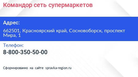 Командор, сеть супермаркетов по адресу 662501, Красноярский край, Сосновоборск, проспект Мира, 1 в дальнейшем Организация, размещена в следующих категориях: