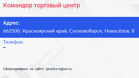 Командор, торговый центр по адресу 662500, Красноярский край, Сосновоборск, Новосёлов, 8 в дальнейшем Организация, размещена в следующих категориях: