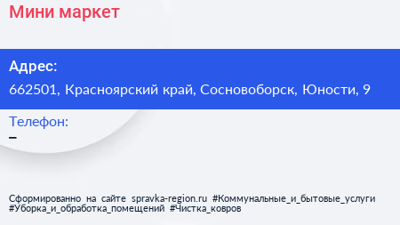 Мини-маркет по адресу 662501, Красноярский край, Сосновоборск, Юности, 9 в дальнейшем Организация, размещена в следующих категориях:
