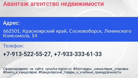 Авантаж, агентство недвижимости по адресу 662501, Красноярский край, Сосновоборск, Ленинского Комсомола, 14 в дальнейшем Организация, размещена в следующих категориях: