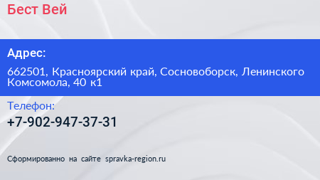 Бест Вей по адресу 662501, Красноярский край, Сосновоборск, Ленинского Комсомола, 40 к1 в дальнейшем Организация, размещена в следующих категориях: