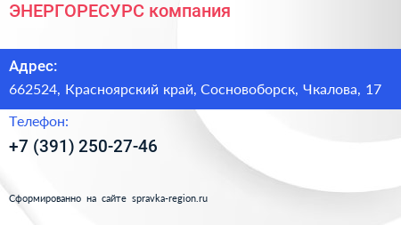 ЭНЕРГОРЕСУРС, компания по адресу 662524, Красноярский край, Сосновоборск, Чкалова, 17 в дальнейшем Организация, размещена в следующих категориях: