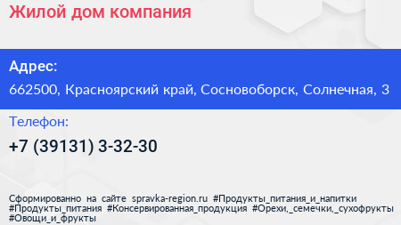 Жилой дом, компания по адресу 662500, Красноярский край, Сосновоборск, Солнечная, 3 в дальнейшем Организация, размещена в следующих категориях:
