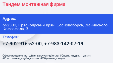 Тандем, монтажная фирма по адресу 662500, Красноярский край, Сосновоборск, Ленинского Комсомола, 3 в дальнейшем Организация, размещена в следующих категориях: