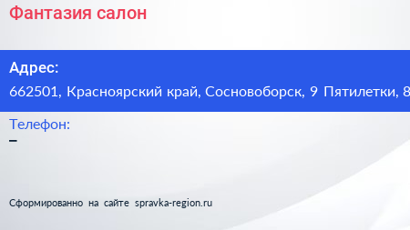 Фантазия, салон по адресу 662501, Красноярский край, Сосновоборск, 9 Пятилетки, 8 в дальнейшем Организация, размещена в следующих категориях: