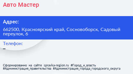 Авто Мастер по адресу 662500, Красноярский край, Сосновоборск, Садовый переулок, 6 в дальнейшем Организация, размещена в следующих категориях: