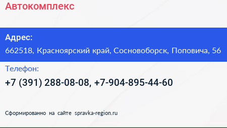 Автокомплекс по адресу 662518, Красноярский край, Сосновоборск, Поповича, 56 в дальнейшем Организация, размещена в следующих категориях:
