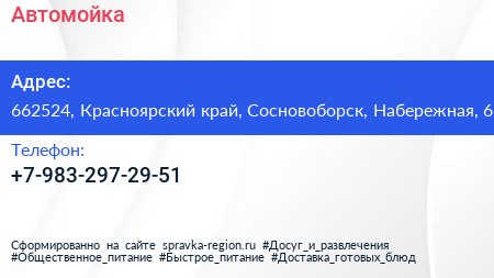 Автомойка по адресу 662524, Красноярский край, Сосновоборск, Набережная, 6 в дальнейшем Организация, размещена в следующих категориях:
