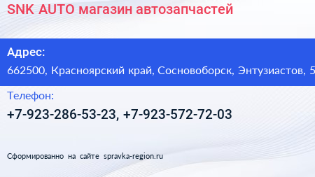 SNK AUTO, магазин автозапчастей по адресу 662500, Красноярский край, Сосновоборск, Энтузиастов, 5 в дальнейшем Организация, размещена в следующих категориях: