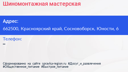 Шиномонтажная мастерская по адресу 662500, Красноярский край, Сосновоборск, Юности, 6 в дальнейшем Организация, размещена в следующих категориях:
