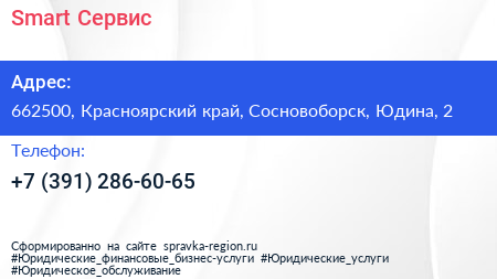 Smart Сервис по адресу 662500, Красноярский край, Сосновоборск, Юдина, 2 в дальнейшем Организация, размещена в следующих категориях: