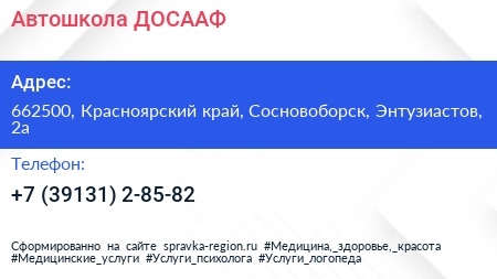 Автошкола, ДОСААФ по адресу 662500, Красноярский край, Сосновоборск, Энтузиастов, 2а в дальнейшем Организация, размещена в следующих категориях: