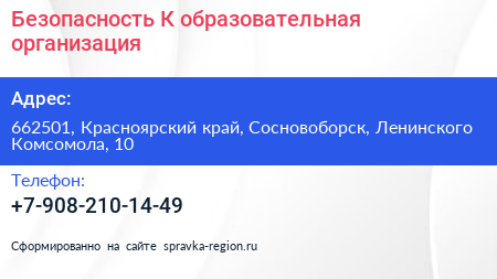 Безопасность-К, образовательная организация по адресу 662501, Красноярский край, Сосновоборск, Ленинского Комсомола, 10 в дальнейшем Организация, размещена в следующих категориях: