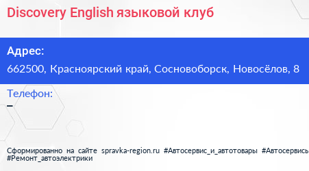 Discovery English, языковой клуб по адресу 662500, Красноярский край, Сосновоборск, Новосёлов, 8 в дальнейшем Организация, размещена в следующих категориях: