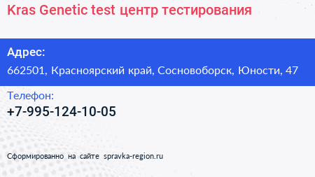 Kras-Genetic-test, центр тестирования по адресу 662501, Красноярский край, Сосновоборск, Юности, 47 в дальнейшем Организация, размещена в следующих категориях: